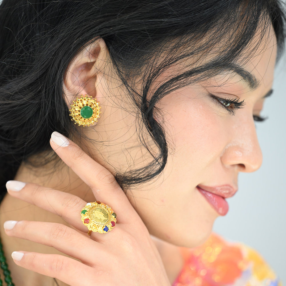 22K+24K YG Stone Coin Ring-1pc